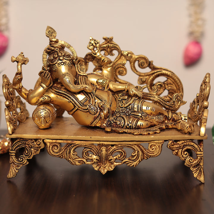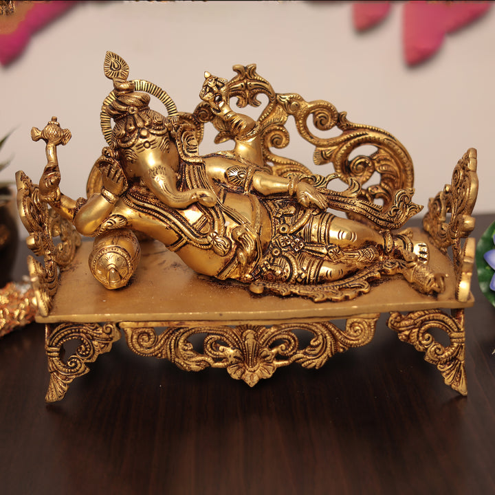 Brass Reclining Seth Ganesh on Singhasan - Symbol of Prosperity, Peace, and Protection