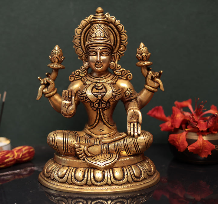Ardhapadmasana Chaturbhuja Lakshmi | 10 Inches | Brass Idol | Handmade