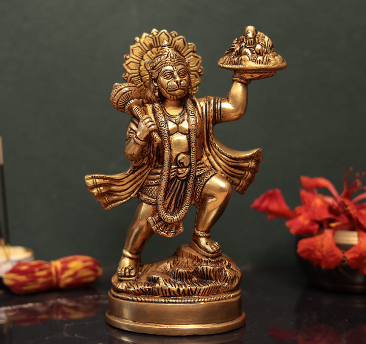 Lord Hanuman Carrying Mountain Of Sanjeevani Herbs Idol In 9.5 Inches | Brass